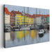 Introducing "Serene Spectrum Dance: Colorful Reflections on Calm Waters," a mesmerizing landscape canvas art that transports you to a tranquil harbor scene teeming with vibrant buildings and serene waters. This captivating artwork beautifully captures a row of charming, multi-colored buildings with facades painted in vivid hues of yellow, red, green, and blue, perfectly mirrored in the calm waters below.