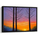 Introducing 'Silent Woods Dusk: A Tranquil Forest Silhouette,' a mesmerizing canvas art print that captures the serene beauty of nature's transition from day to night. This artwork showcases a breathtaking sunset painted with a vibrant palette of fiery oranges, deep purples, and soothing pinks, enveloping the sky in a warm, ethereal glow.