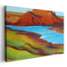 The rugged terrain is depicted in rich reds and oranges, portraying arid, rocky formations that stand majestically against the horizon. Lush patches of green vegetation dot the riverbank, adding a touch of vibrancy to the landscape. The artist's masterful use of color blending creates a harmonious balance between the cool blues of the river and the warm earth tones of the land, enhancing the visual impact of the artwork.
