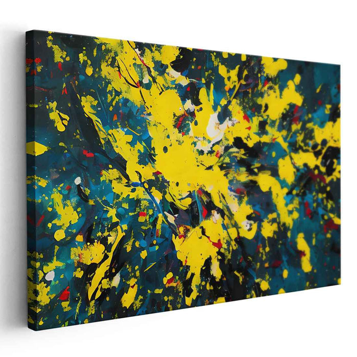 Introducing "Sunshine Serenade Symphony," an electrifying abstract expressionist yellow and blue canvas art print that pulsates with vibrant energy and color, reminiscent of the dynamic style of abstract expressionism. This captivating artwork is a visual explosion of bold splashes and drips of bright yellow, bursting forth from the center in a chaotic yet harmonious dance.