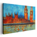 Introducing 'Surreal Clock Tower Symphony,' a mesmerizing canvas art print that captures the iconic Houses of Parliament and Big Ben in London with a bold and vibrant flair. This artwork is a symphony of color, dominated by a fiery orange hue that ignites the scene, set against a deep, luscious blue sky and the reflective waters of the river.