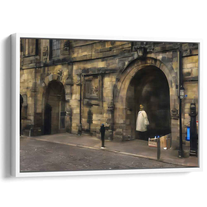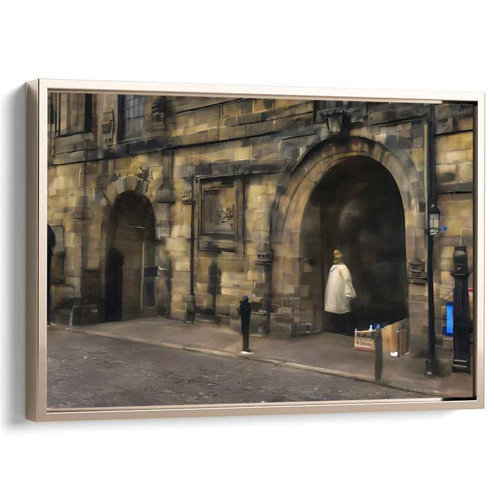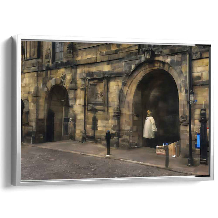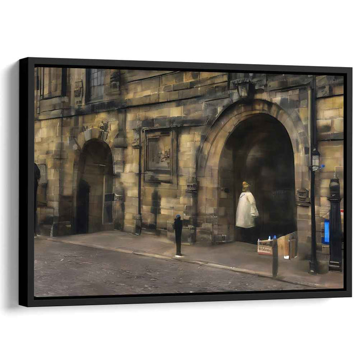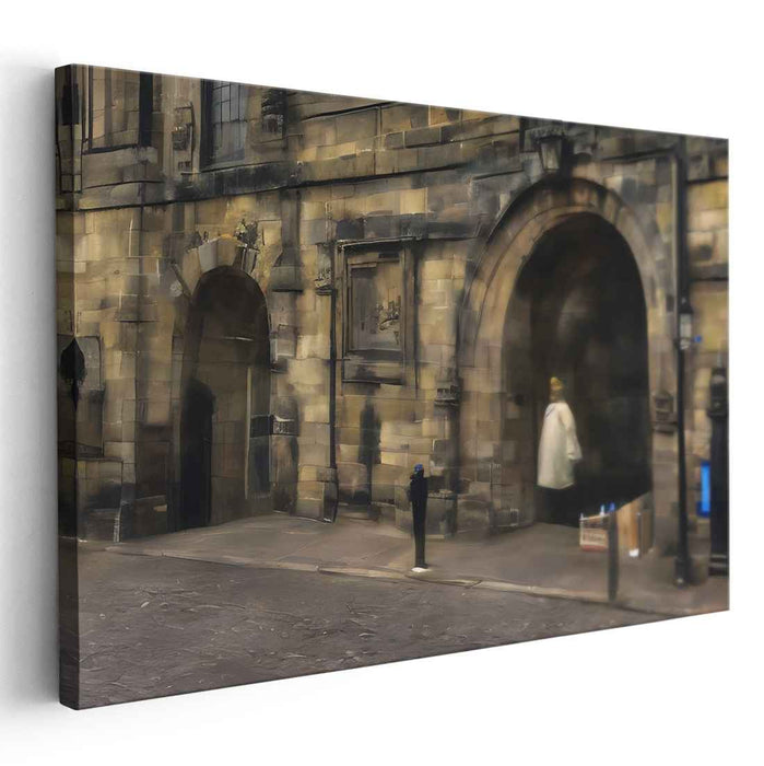 Introducing 'Timeless Archways: A Solitary Figure in Historical Urban Landscape,' a captivating canvas art piece that transports viewers to a bygone era, where history whispers through the weathered stones of an ancient building. This evocative artwork features a lone figure, cloaked in mystery, standing under the arch of a majestic structure on a cobblestone street.