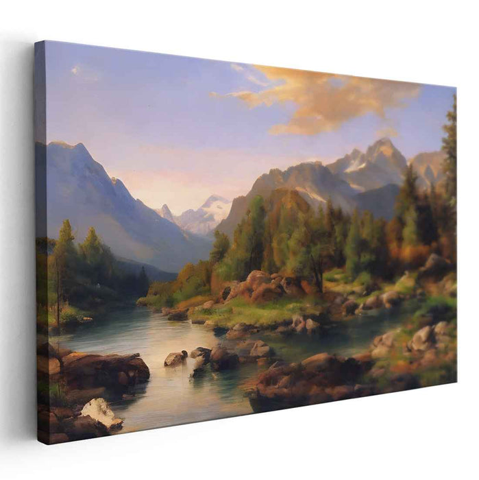 Introducing "Tranquil Mountain Sunset," a mesmerizing landscape canvas art print that transports viewers to a mountainous haven basking in the golden embrace of a setting sun. This exquisite artwork captures the essence of serenity as a tranquil river meanders through verdant foliage, flanked by majestic snow-capped peaks in the distance.