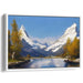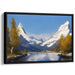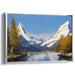 The foreground of this artwork is adorned with the rich hues of autumnal trees, their golden and orange leaves providing a striking contrast to the cool blues and whites dominating the sky and mountains. The artist's meticulous brushwork and keen attention to detail breathe life into the natural elements, creating a sense of realism and tranquility that captivates the viewer.