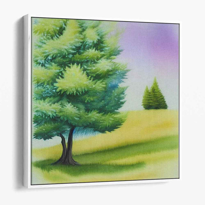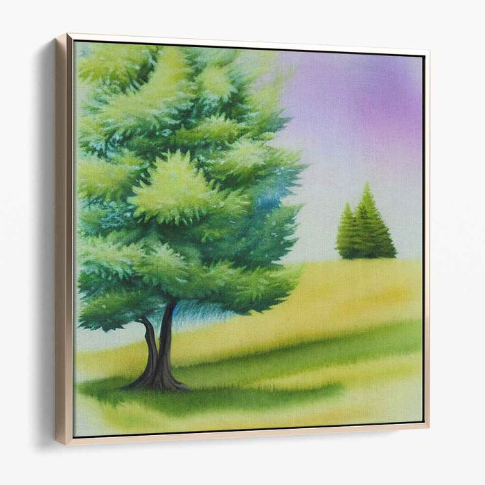 The focal point of this artwork is a majestic tree, meticulously depicted with a myriad of green hues that breathe life into the canvas. The intricate detailing of the leaves and the sturdy trunk exude a sense of vitality and strength, while a distant tree mirrors this grandeur, establishing a perfect equilibrium within the composition. The background, awash with dreamy purples and blues, conjures a tranquil morning mist, adding a touch of ethereal beauty to the scene.