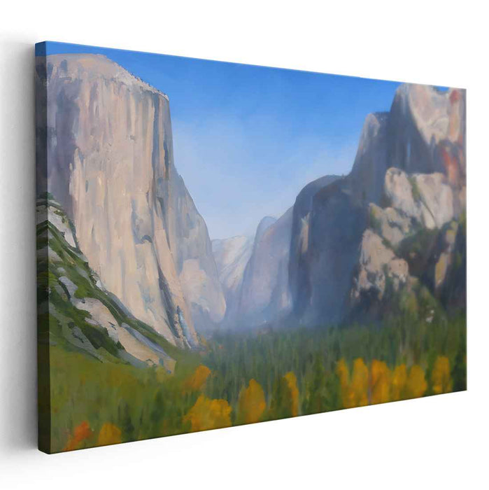 Introducing 'True to Nature Vista,' a mesmerizing landscape canvas art that transports viewers to a majestic mountainous valley reminiscent of the iconic vistas of Yosemite National Park. This breathtaking painting captures the grandeur and timeless beauty of towering granite cliffs against a clear, azure sky.