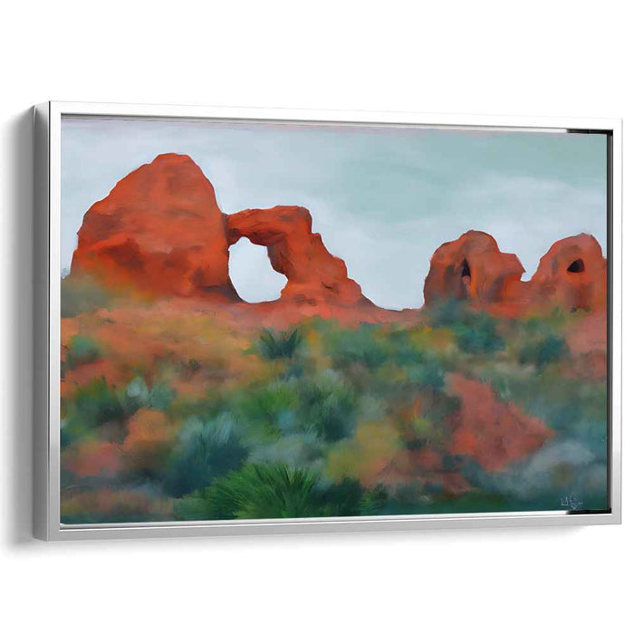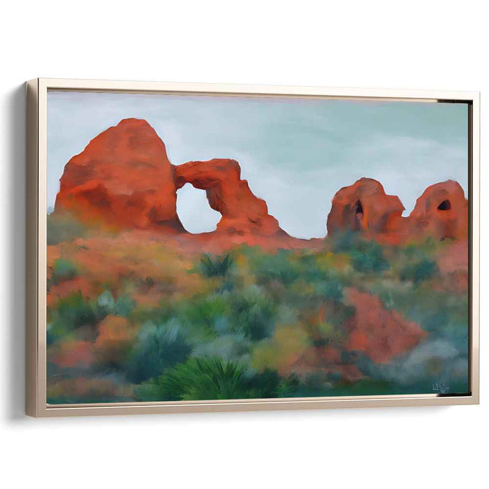 Introducing "Tumbleweed Trails: Southwestern Desert Landscape Canvas Art Print," a mesmerizing depiction that transports viewers deep into the rugged beauty of the American Southwest, capturing the iconic red rock formations that define this enchanting region. The focal point of this artwork is a series of monumental rock arches, their vibrant red hues contrasting boldly against a soft, pastel sky, creating a visual symphony of colors and textures.