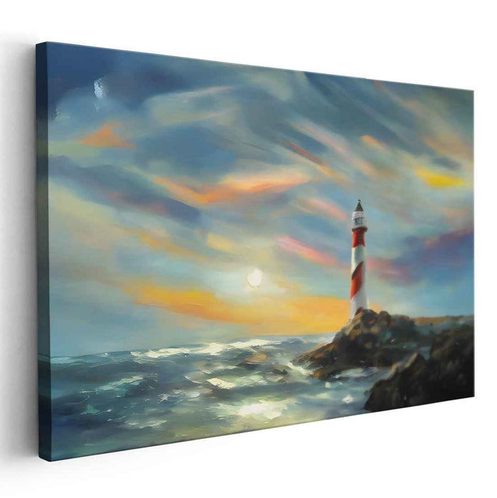 Twilight Beacon Shores: Coastal Sunset Lighthouse Canvas Art Print