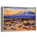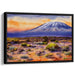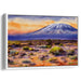 The sky serves as a magnificent canvas, painted with hues of orange and soft yellow, juxtaposed against the deep blues and purples of the distant mountain, creating a captivating dance of warm and cool tones. The foreground, adorned with rugged terrain and sparse vegetation in lively greens and earthy browns, adds richness and dimension to the composition.