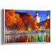 Introducing 'Twilight Serenade in Brushstrokes: Impressionist Riverside Town at Twilight,' a mesmerizing canvas art that transports viewers to a tranquil riverside town basking in the golden embrace of autumn. This captivating artwork captures a serene scene dominated by a row of trees ablaze with the vibrant colors of fall—reds, oranges, and yellows, signaling the peak of the season. The town's majestic architecture, including a prominent church with twin spires, stands tall against a deep twilight blue sky, creating a captivating contrast with the fiery tree canopy.