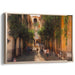 The focal point of this piece is a sun-drenched cobblestone street, teeming with activity as people go about their daily routines amidst old buildings adorned with verdant greenery. The interplay of light and shadow adds depth and movement to the scene, emphasizing the contrast between the sunlit areas and the cool, shaded corners.