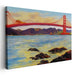 Introducing "Urban Suspension Perspective: Scenic San Francisco Bridge Canvas Art," a mesmerizing depiction of the iconic Golden Gate Bridge in San Francisco that graces the canvas with its majestic presence. The bridge, painted in a bold and striking red hue, commands attention against the tranquil blue waters and a sky that transitions from soft yellows and oranges to deeper blues, creating a harmonious symphony of colors.