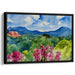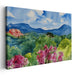 The foreground of the painting is adorned with vivid pink and red blooms that pop against the lush greenery covering the gentle hills. In the distance, the mountains, painted in soft blues and purples, exude a sense of tranquility and elegance, creating a harmonious contrast with the vibrant flora in the forefront. The sky, painted with delicate washes of blue and interspersed with fluffy white clouds, imparts a light and airy atmosphere to the scene.