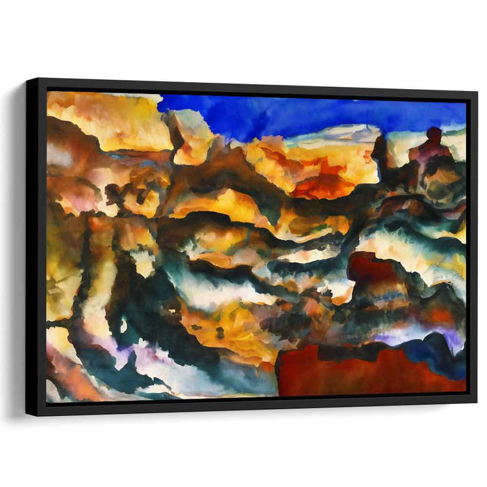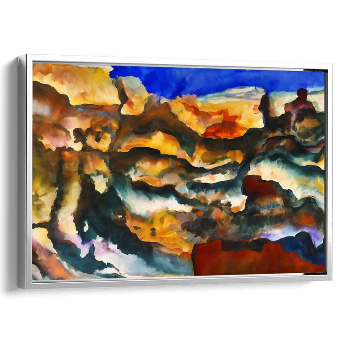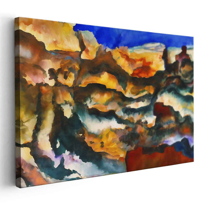 Introducing 'Vibrant Canyon,' an abstract expressionist landscape canvas art print that mesmerizes viewers with its fusion of abstract forms and vivid, naturalistic colors. This captivating artwork is a symphony of earth tones, showcasing a rich tapestry of ochres, browns, and deep reds, harmoniously intertwined with vibrant blues and purples.
