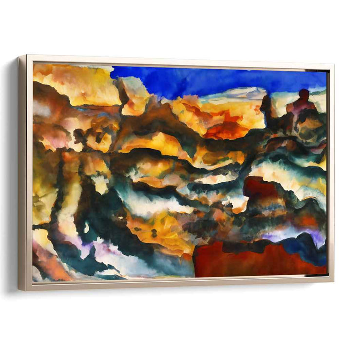 The painting depicts a rugged terrain, possibly a canyon or desert, with undulating forms that echo the raw beauty of geological formations. The artist's fluid, watercolor-like technique seamlessly blends hues, creating a profound sense of depth and movement. Splashes of bright blue at the top sharply contrast with the warm tones below, evoking a meeting of sky and rocky landscape, infusing the piece with a dramatic, almost surreal ambiance.