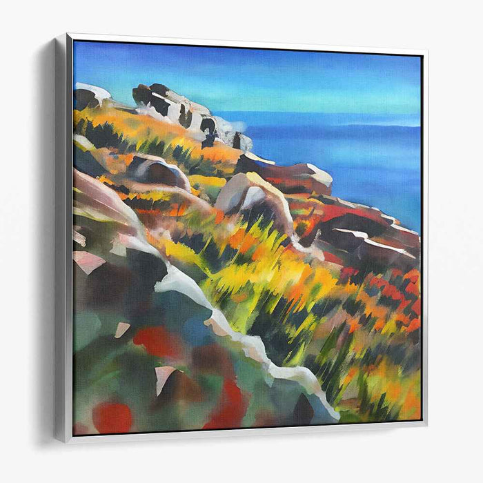 Introducing "Vibrant Coastal Blossoms," an enchanting Impressionist landscape canvas art print that transports viewers to a vibrant coastal paradise, where nature's palette bursts forth in a symphony of colors. This captivating artwork depicts a rocky hillside adorned with a profusion of wildflowers in full bloom, tumbling gracefully towards the tranquil, azure waters of the ocean.