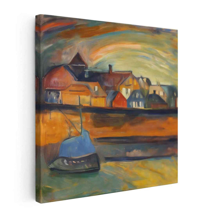 Vibrant Dusk Impressions: Expressionist Sunset Over Seaside Village Canvas Art
