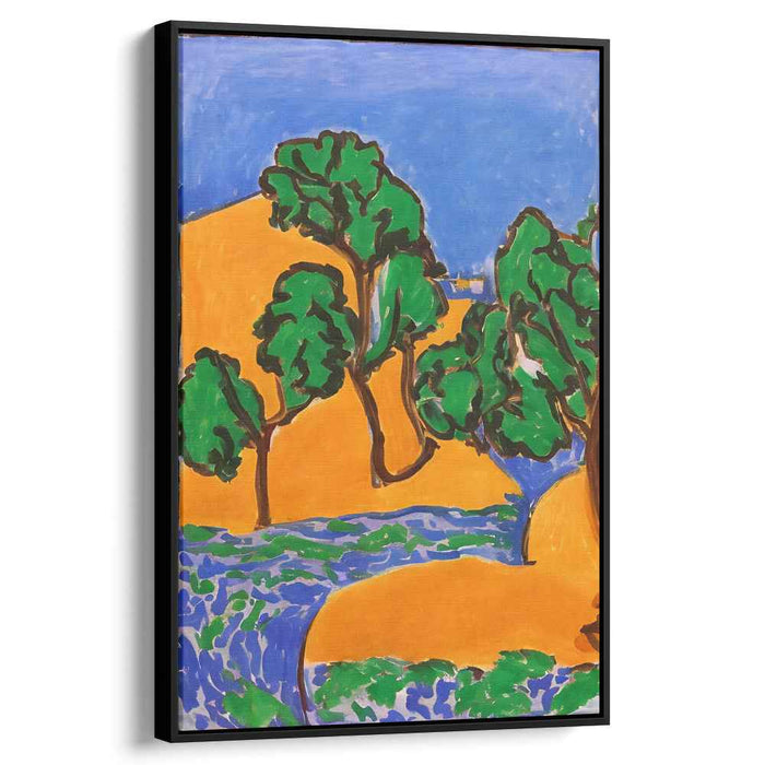 Embracing a bold, almost Fauvist style, the artwork employs exaggerated colors and simplified forms reminiscent of Henri Matisse's pioneering works. Thick, dark outlines around the trees and other elements enhance the painting's graphic quality, lending it a modern and abstract feel. This piece is a testament to the artist's mastery in blending traditional landscape motifs with a contemporary, avant-garde approach.
