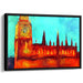 Introducing 'Vintage Thames Reflections,' a mesmerizing canvas art print that transports viewers to the iconic Westminster Palace and Big Ben in London, capturing a dramatic sunset in a burst of fiery hues. This artwork is a symphony of bold brush strokes and vivid colors, predominantly showcasing intense shades of orange set against a tranquil turquoise blue sky.