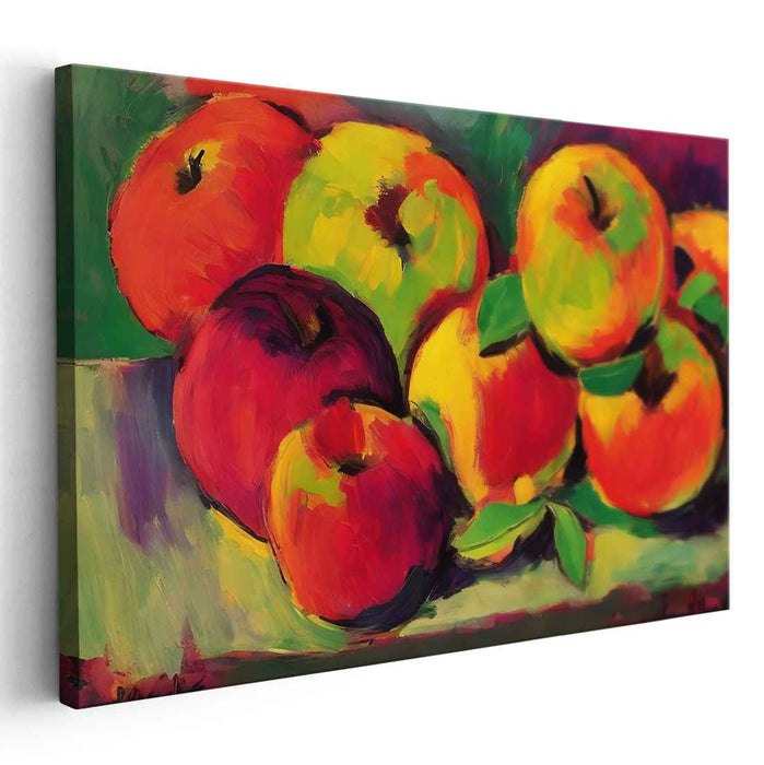 Introducing 'Vivid Harvest Palette: Expressive Still Life of Apples in Bold Colors,' a mesmerizing canvas art that captures the essence of a bountiful harvest in a burst of vivid hues and dynamic textures. This artwork showcases a group of apples as the central focus, painted in striking shades of red, yellow, and green, exuding a sense of vibrancy and vitality.