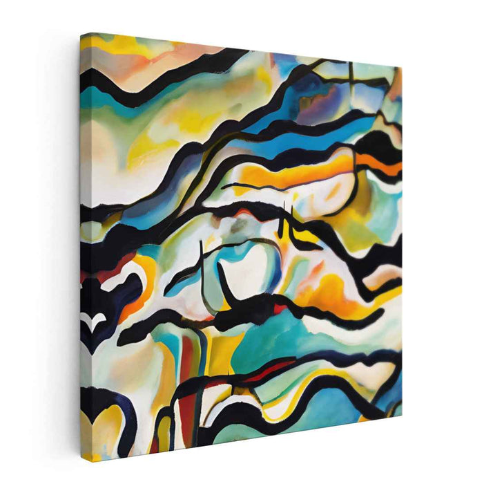 The canvas is alive with bold, sweeping lines and a palette dominated by deep blues that meander like a river, entwined with bursts of vivid yellows, oranges, and greens. These colors dance together in a beautifully ordered chaos, evoking a sense of vitality and motion that captivates the eye.