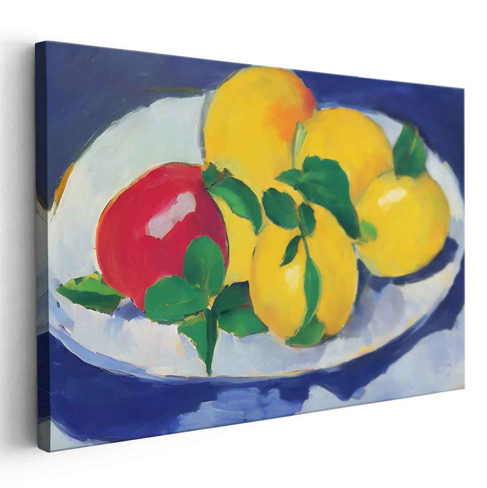 Introducing "Vivid Juicy Mirage," a mesmerizing still life canvas art that exudes a burst of energy through a vibrant arrangement of citrus fruits, predominantly lemons, with a striking red apple stealing the show, all delicately placed on a pristine white plate. This captivating artwork is a celebration of color and contrast, with the vivid yellow of the lemons taking center stage, offering a refreshing and lively visual feast for the eyes.