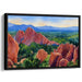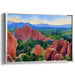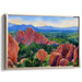 The foreground showcases rugged, reddish rock formations typical of the American Southwest, depicted in rich warm oranges and deep reds, contrasting beautifully with lush greens of surrounding foliage. Moving beyond these striking formations, the vista unfolds to reveal rolling hills and distant mountains painted in soothing shades of blue and purple, evoking a sense of vastness and late afternoon tranquility. The clear azure sky enhances the overall peacefulness of the scene.
