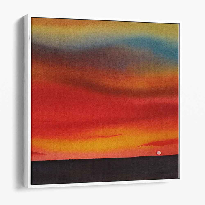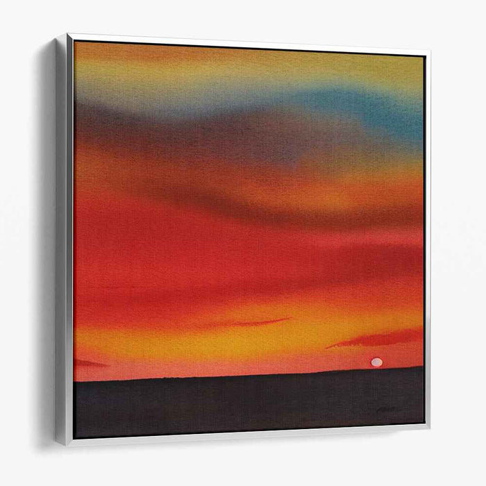 Introducing "Watercolor Beyond the Sky: Watercolor Horizon," a mesmerizing canvas art print that captures the serene beauty of a sunset dipping below the horizon, enveloping the scene in a warm, inviting glow. This captivating artwork focuses on a striking gradient of colors, transitioning from deep reds and oranges near the horizon to softer hues of yellow and blue as the sky ascends, creating a sense of tranquility and peace.