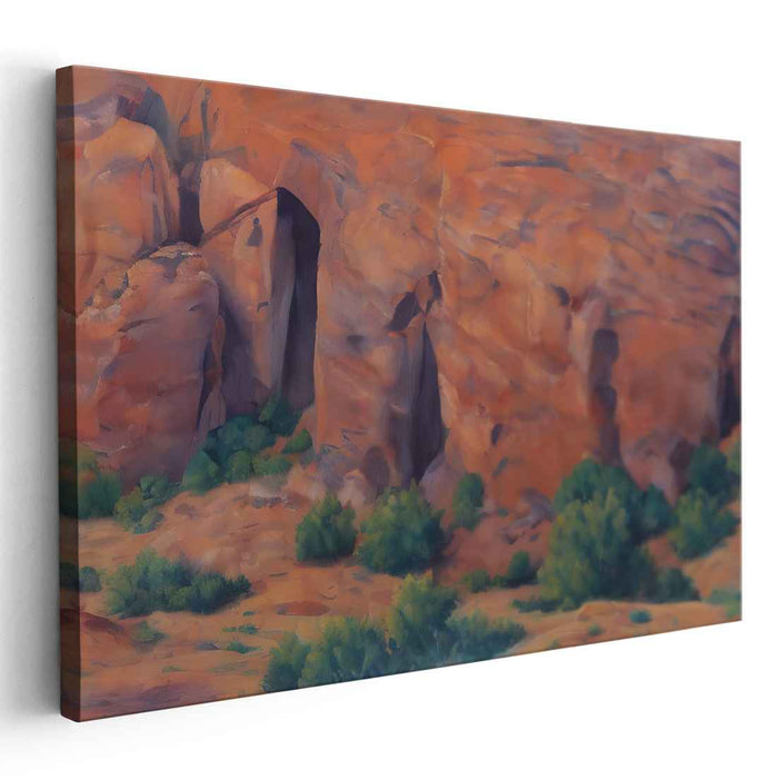 Beneath the towering canyon walls, vibrant green shrubs stand out against the arid backdrop, symbolizing resilience and vitality in the midst of the harsh desert environment. The overall mood of the artwork exudes awe and serenity, encouraging viewers to pause and contemplate the timeless beauty of nature.