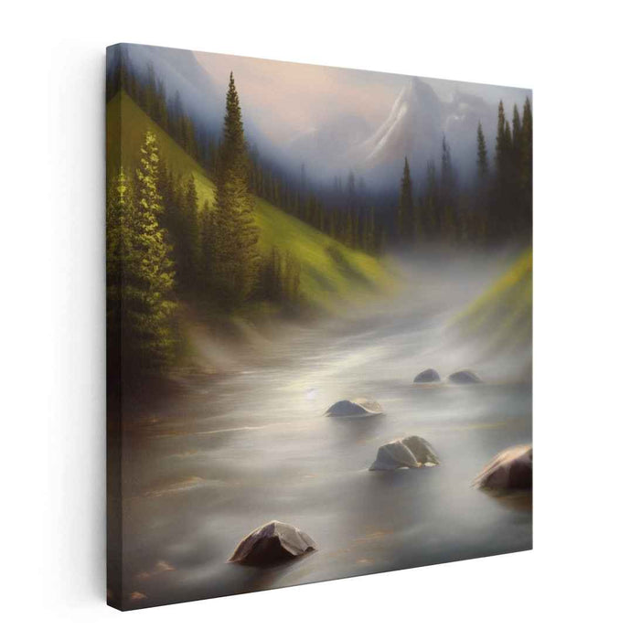 The river, adorned with smooth boulders, adds a tactile charm to the composition, guiding your gaze through the tranquil setting. Flanked by verdant hills, cloaked in a dense forest of majestic pine trees, the painting exudes a sense of depth and vastness. In the distance, snow-capped mountains stand tall, veiled in a delicate mist that lends a dreamy aura to the landscape.