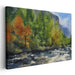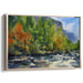 The foreground features a lively river, adorned with meticulously crafted rocks and glistening water, creating a lively juxtaposition with the tranquil trees. Standing out amidst the lush greens and yellows is a striking orange tree, symbolizing the autumn season and serving as the focal point of the composition. The artist's fluid watercolor technique allows colors to blend harmoniously, infusing the scene with depth and realism.