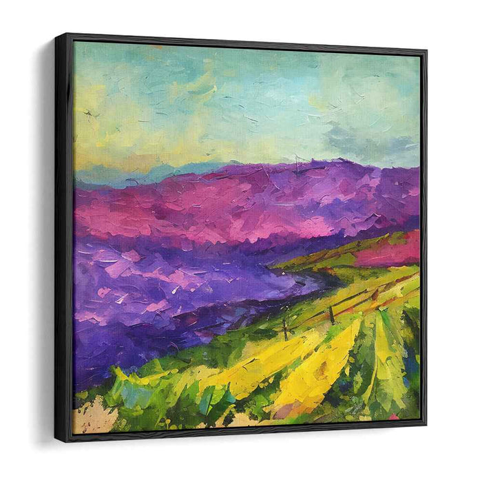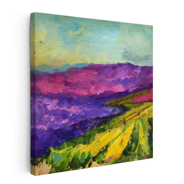 The foreground of the painting is adorned with striking yellow paths that meander through lush greenery, drawing the eye towards the regal purple mountains in the distance, all set against a sky painted with gentle shades of blue and light yellow. The artist's use of the impasto technique, characterized by the application of thick layers of paint, creates a tactile texture that enhances the vibrancy of the colors, infusing the artwork with a palpable sense of liveliness.