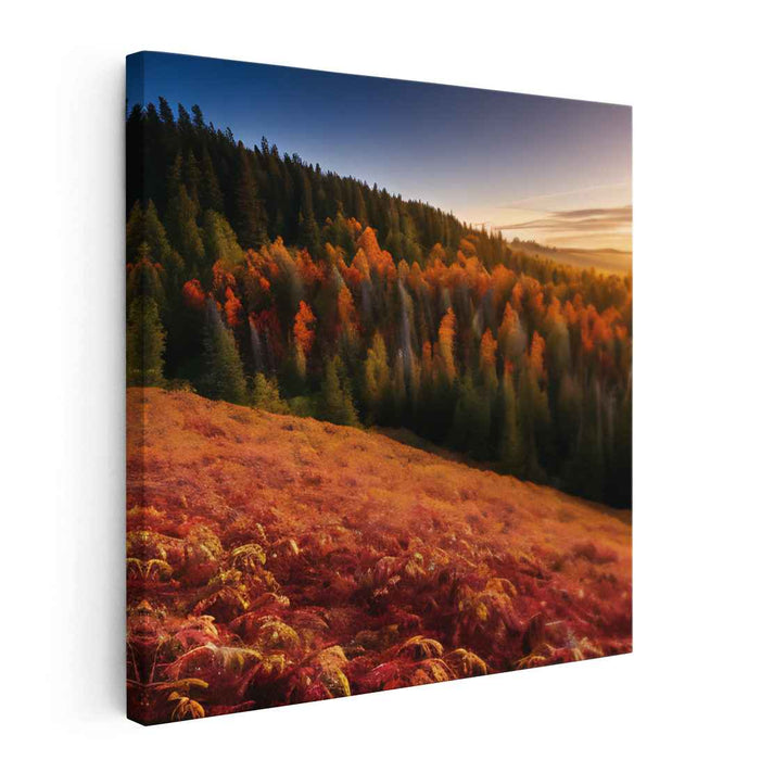 Introducing 'Whispers Among Emerald Canopies: Serene Sunset Over a Vibrant Forest,' a captivating landscape canvas art print that transports you to a tranquil autumn forest bathed in the warm hues of the setting sun. This breathtaking artwork captures the essence of the fall season with a vibrant display of red, orange, and yellow foliage painting a mesmerizing picture.