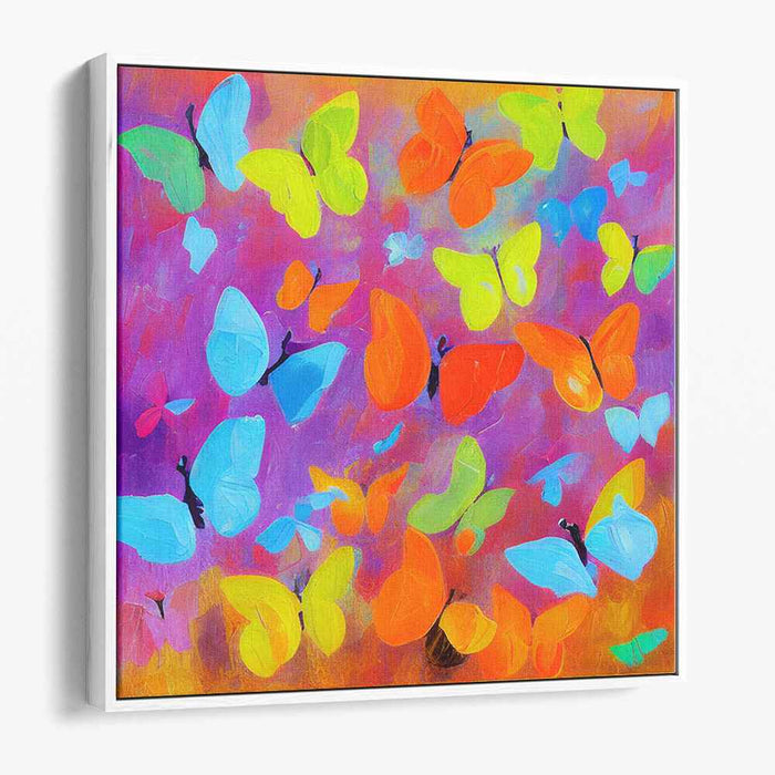 Introducing "Whispers in Colorful Wings," an exuberant abstract butterfly canvas art print that mesmerizes with a kaleidoscope of color and motion, capturing a magical dance of butterflies in full flight. This vivacious artwork is a jubilant celebration of nature's beauty, where a symphony of radiant hues bursts forth, painting a vibrant spectacle on the canvas.