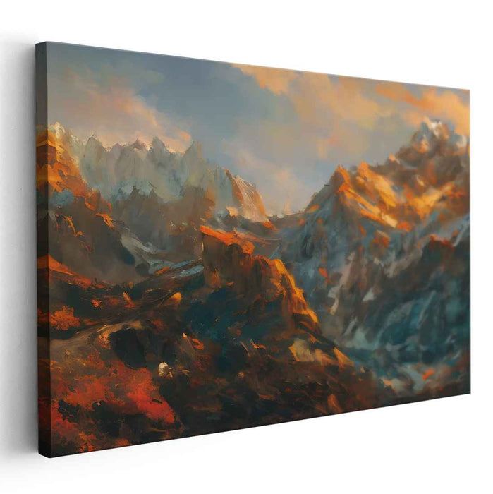 Introducing 'Whispers Of Twilight Mist,' a mesmerizing landscape canvas art print that encapsulates the grandeur and tranquility of a mountainous terrain basking in the warm glow of a setting sun. This captivating artwork portrays majestic peaks reaching towards the heavens, their rugged exteriors bathed in a golden light that creates striking contrasts of shadows and highlights.