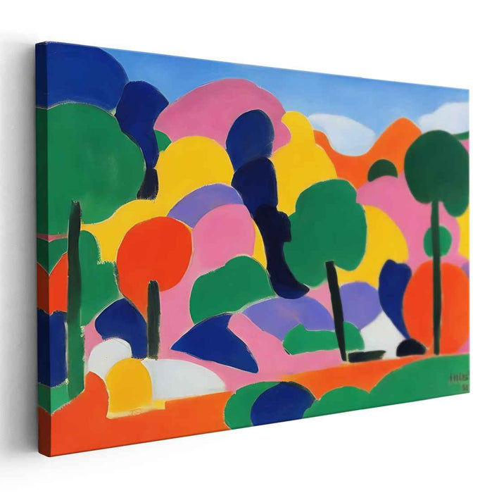 The artwork's composition features abstract renditions of trees and rolling hills, imbuing the scene with a sense of depth and motion, beckoning the observer to immerse themselves in its whimsical world. The artist's adept use of vivid colors and dynamic forms evokes a sense of energy and vitality, drawing inspiration from the Fauvism movement's bold and expressive style.