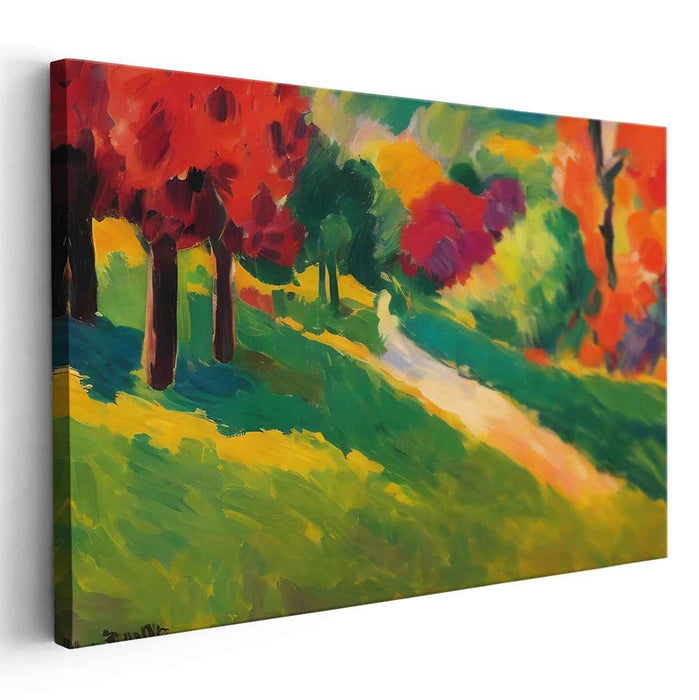 The artist has skillfully employed a bold palette of primary colors, with striking emphasis on lush greens of the grass and foliage, fiery reds and oranges of the trees, and radiant yellows of the sun-kissed path. Complementing these hues are rich purples and deep blues that infuse the composition with depth and contrast, creating a visual feast for the eyes.
