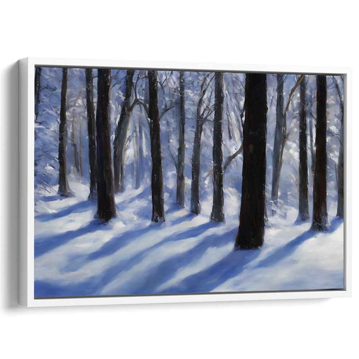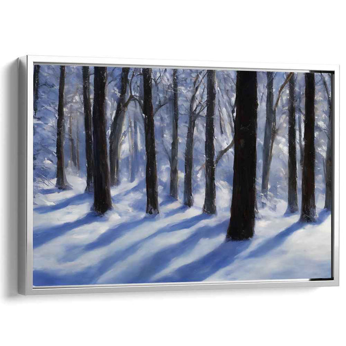 Step into the serene beauty of 'Winter's Silent Embrace: Serene Snow-Covered Forest Landscape,' a mesmerizing canvas art that transports you to a tranquil winter forest. The artwork depicts towering trees cloaked in snow, casting intricate shadows on the untouched snowy ground, creating a scene of serene stillness.