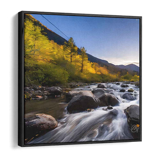 Mystic Glade Melody: Golden Forest and Flowing River Landscape Canvas Art