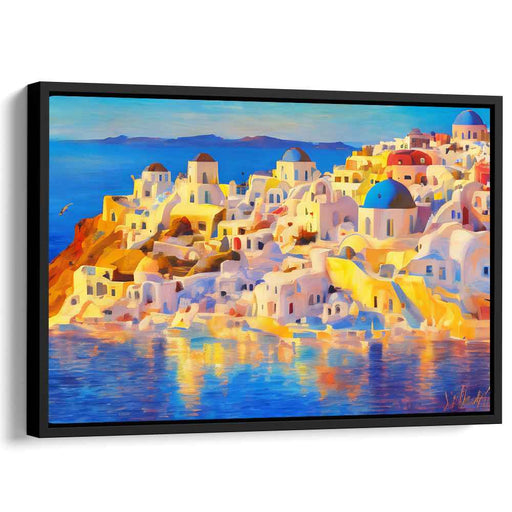 Santorini Sunset Serenity: Blue Domes and Golden Horizons Canvas Art Print