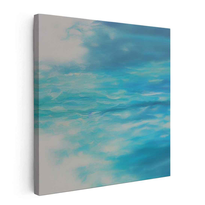 The artwork is a harmonious blend of blues and greens, with a dominant soothing blue hue that engulfs the canvas. Secondary colors like teal, turquoise, and hints of white create a calming visual experience, mimicking the ebb and flow of ocean waves with gentle transitions and soft, flowing lines.