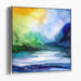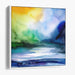 The canvas's upper portion is adorned with a radiant yellow exuding the warmth of a sunrise or sunset, seamlessly transitioning into vibrant greens reminiscent of lush meadows or rich vegetation. As the eyes wander, the colors transform into cool blues and purples, mirroring a tranquil body of water reflecting the sky above.