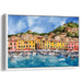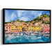 Introducing "Aquatic Haven," a mesmerizing canvas art print that transports you to a coastal Mediterranean village, reminiscent of the charming towns along the Italian Riviera. This artwork captures the essence of a vibrant and lively scene, where colorful buildings elegantly line the waterfront, their reflections shimmering on the tranquil waters below.
