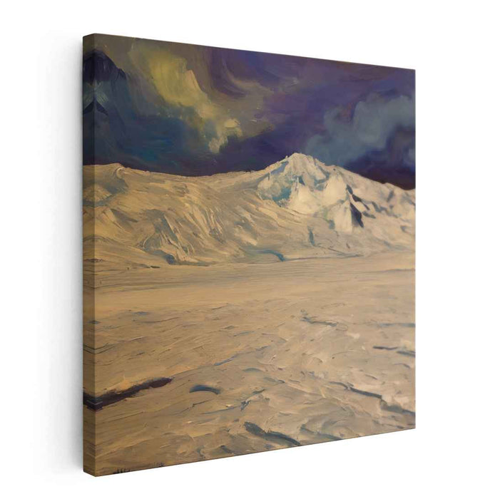 Introducing "Avalanche of Light," a mesmerizing canvas art print that transports viewers to the serene and majestic landscape of a snow-covered mountain range under a dramatic sky. This captivating artwork masterfully captures the vastness and solitude of the scene, using sweeping brushstrokes to convey the texture of the snow and the ruggedness of the mountain peaks.