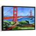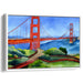 The artist has skillfully employed a vibrant palette dominated by the bridge's signature International Orange, creating a striking contrast against the serene blues of the sky and the bay. The lush greens of the surrounding landscape provide a natural and harmonious counterpoint, infusing the scene with depth and richness.