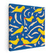 Introducing "Bright Flock," a vibrant and captivating abstract canvas art print that features a flock of bright yellow birds set against a deep blue background, creating a mesmerizing contrast that instantly captures the viewer's attention. The composition showcases the birds in various lively poses, some in flight and others at rest, imbuing the artwork with a sense of dynamic movement and liveliness.