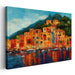 Step into the enchanting world of 'Brushstrokes Dance With Color: A Vibrant Impressionist View,' a mesmerizing canvas art print that transports you to a serene lakeside village basking in the golden hues of a sunset. This captivating artwork showcases a cluster of delightful, multicolored buildings nestled harmoniously against a verdant hillside, casting enchanting reflections on the calm waters below.