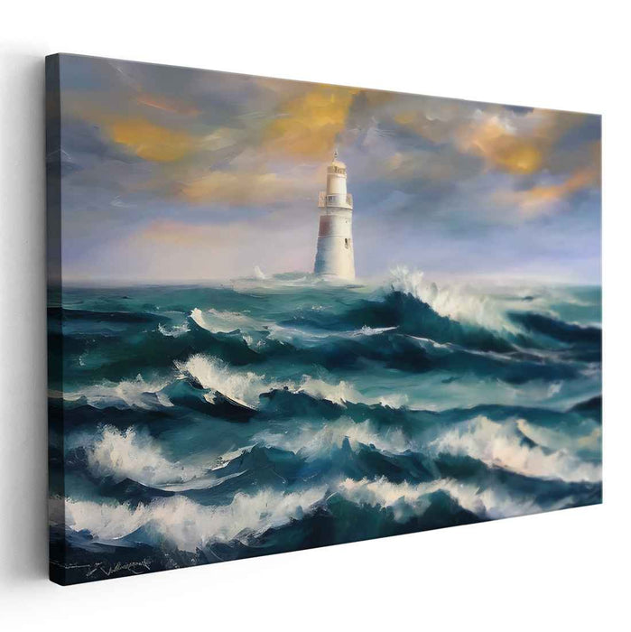 Introducing 'Brushstrokes of Fury,' a mesmerizing canvas art print that captures the essence of resilience and guidance amidst the chaos of stormy seas. This captivating artwork portrays a solitary lighthouse, a beacon of hope, standing tall and unwavering against the relentless waves of a tempestuous ocean.