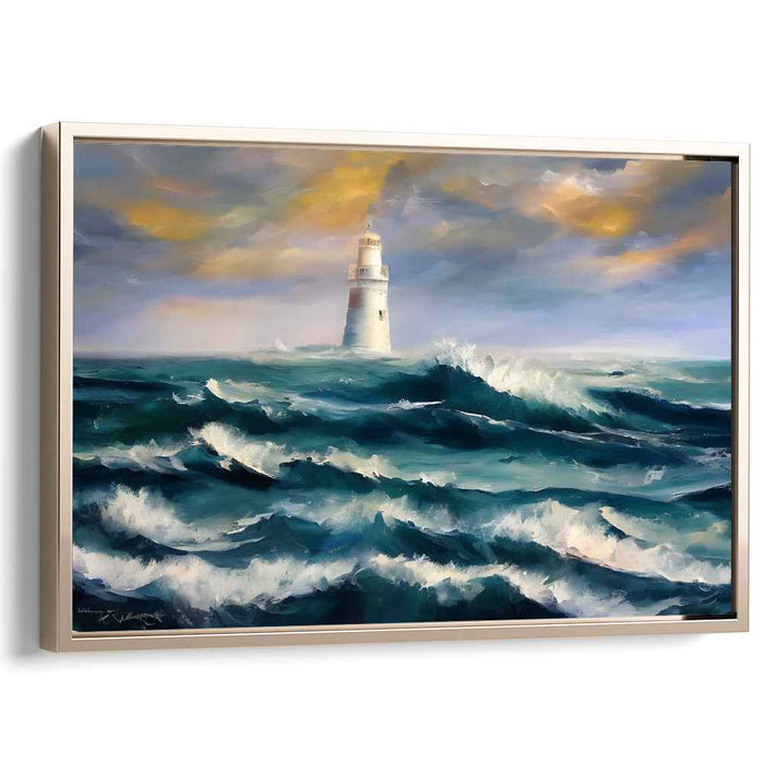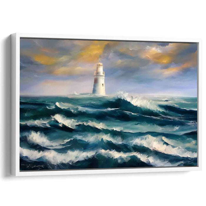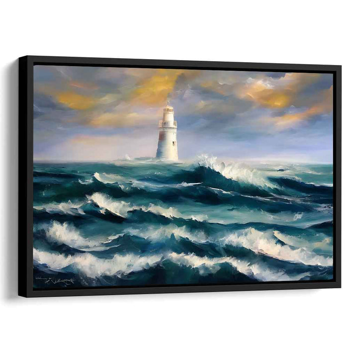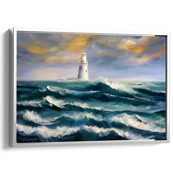 The lighthouse, painted in striking white, serves as a powerful symbol of strength and guidance in the face of adversity. The artist's bold brushstrokes skillfully depict the tumultuous movement of the waves, conveying the raw power and energy of the sea in a mesmerizing display of artistry.