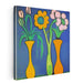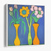 Introducing 'Cerulean Botanical Symphony: Colorful Floral Arrangements on Blue Canvas Art Print,' a mesmerizing piece that captures the essence of joy and vibrancy through a trio of vividly colored vases set against a rich blue backdrop. This artwork is a celebration of color and nature, presenting three distinct floral arrangements that instantly captivate the viewer with their bold and lively hues.